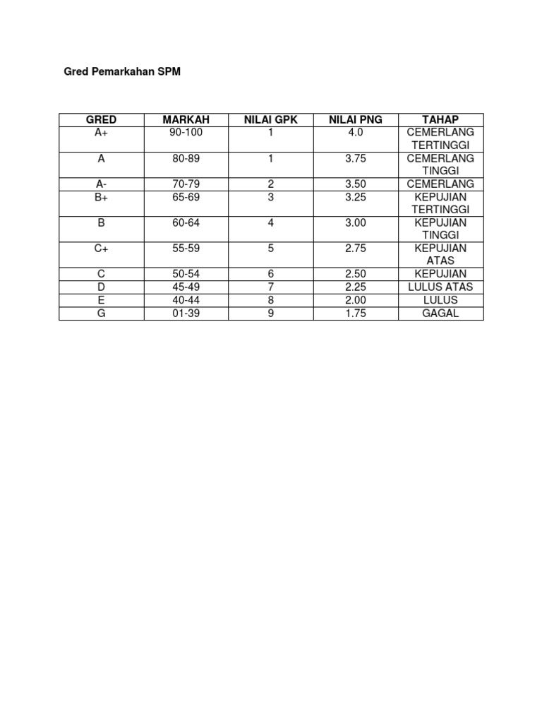 Berikut dikongsikan adalah maklumat tentang sistem gred pemarkahan peperiksaan upsr, pt3 dan spm terkini bagi sekolah rendah dan sekolah menengah. Sistem gred pemarkahan upsr terkini. Usia purata pelajar semasa mengambil spm ini ialah 17 tahun, iaitu semasa di tingkatan 5. Panduan buat pelajar tahun enam, tingkatan tiga berikut dikongsikan adalah maklumat tentang sistem gred pemarkahan peperiksaan upsr, pt3 dan spm terkini bagi sekolah rendah dan sekolah menengah Berikut dikongsikan julat markah untuk peperiksaan dan ujian bagi penetapan gred markah bagi sekolah rendah dan sekolah menengah di malaysia. Ia merupakan ujian terakhir pendidikan menengah atas. Berikut dikongsikan gred markah upsr terkini sekolah rendah yang dikongsikan dari saps nkra. Izah assrin gred pemarkahan spm. Savesave gred pemarkahan spm.docx for later. Petisyen bagi pengurangan gred pemarkahan kertas add math dan. Gred pemarkahan terkini bagi upsr, pt3 dan spm 2019|untuk pengetahuan anda, gred pemarkahan peperiksaan untuk upsr, pt3 dan spm yang digunapakai oleh seluruh sekolah adalah dalam sistem saps nkra. Pengenalan sistem pemarkahan spm yang terbaru. Ade x data lengkap yg sediakan permakahan ni mngikut sbjek2?
