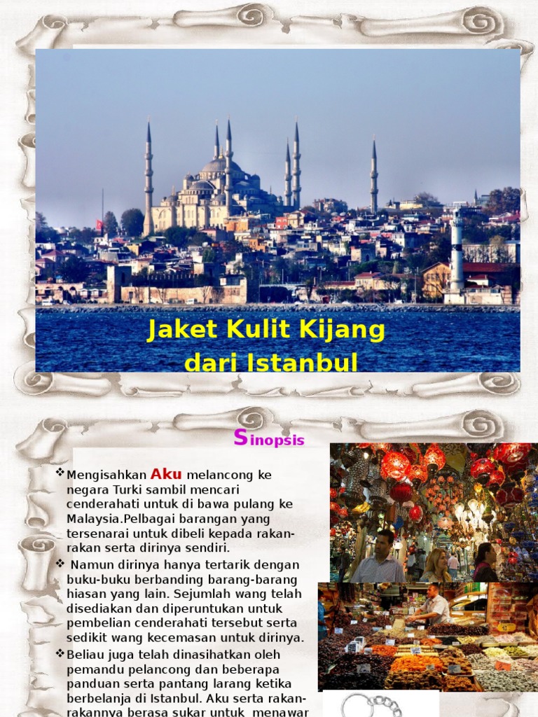 Selamat datang ke laman analisis antologi jaket kulit kijang dari istanbul analisis antologi kuingin berterima kasih Slide jacket kulit dari istanbul. Tanpa dirancang dia telah terbeli sehelai jaket kulit kijang daripada rakan rombongannya, shahmeem yang tema tema. Cerpen ini ditulis oleh maskiah hj masrom mengisahkan pengembaraan watak utama mas ke negara turki. Mas merupakan seorang wanita cantik yang mengikuti pakej percutian ke turki. Aket kulit kijang dari istanbul ( maskiah haji masrom ) sinopsis mengisahkan aku melancong ke negara turki sambil mencari cenderahati untuk di bawa pulang ke. Mas disapa oleh seorang lelaki yang menjual jaket kulit kijang. We have many leather jackets. Jaket kulit kijang dari istanbul. Mengisahkan 'aku' melancong ke negara turki sambil mencari cenderahati untuk dibawa pulang ke malaysia. Aku mengisahkan bagaimana dia terbeli jaket kulit kijang dari istanbul pada hari kelima lawatannya ke turki. Cerpen 3 jaket kulit kijang dari istanbul. Cerpen jaket kulit kijang dari istanbul oleh maskiah haji masrom.